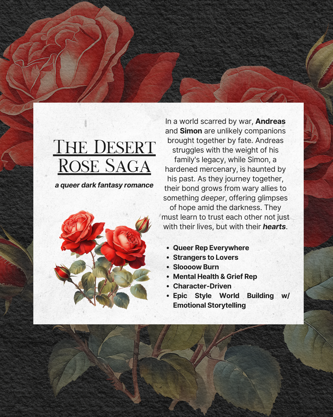 The next installment of the Desert Rose Saga follows Simon and Andreas as old wounds are reopened, and they’re forced to confront their growing feelings for one another.What awaits them as they leave the city of Sebree eight months after being sent into isolation? Will Simon be able to confront his inner demons? Will Andreas uncover answers to a surprising revelation about his family? What challenges lie ahead as new foes emerge and a hidden piece of the world’s history claws to light?